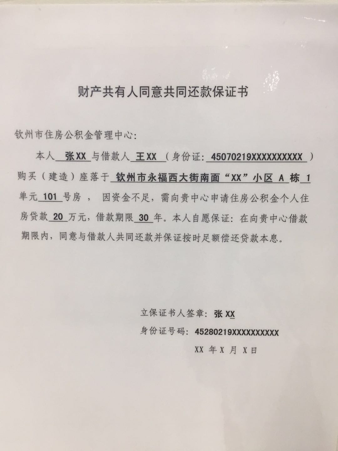 财产共有人同意共同还款保证书----填写范例