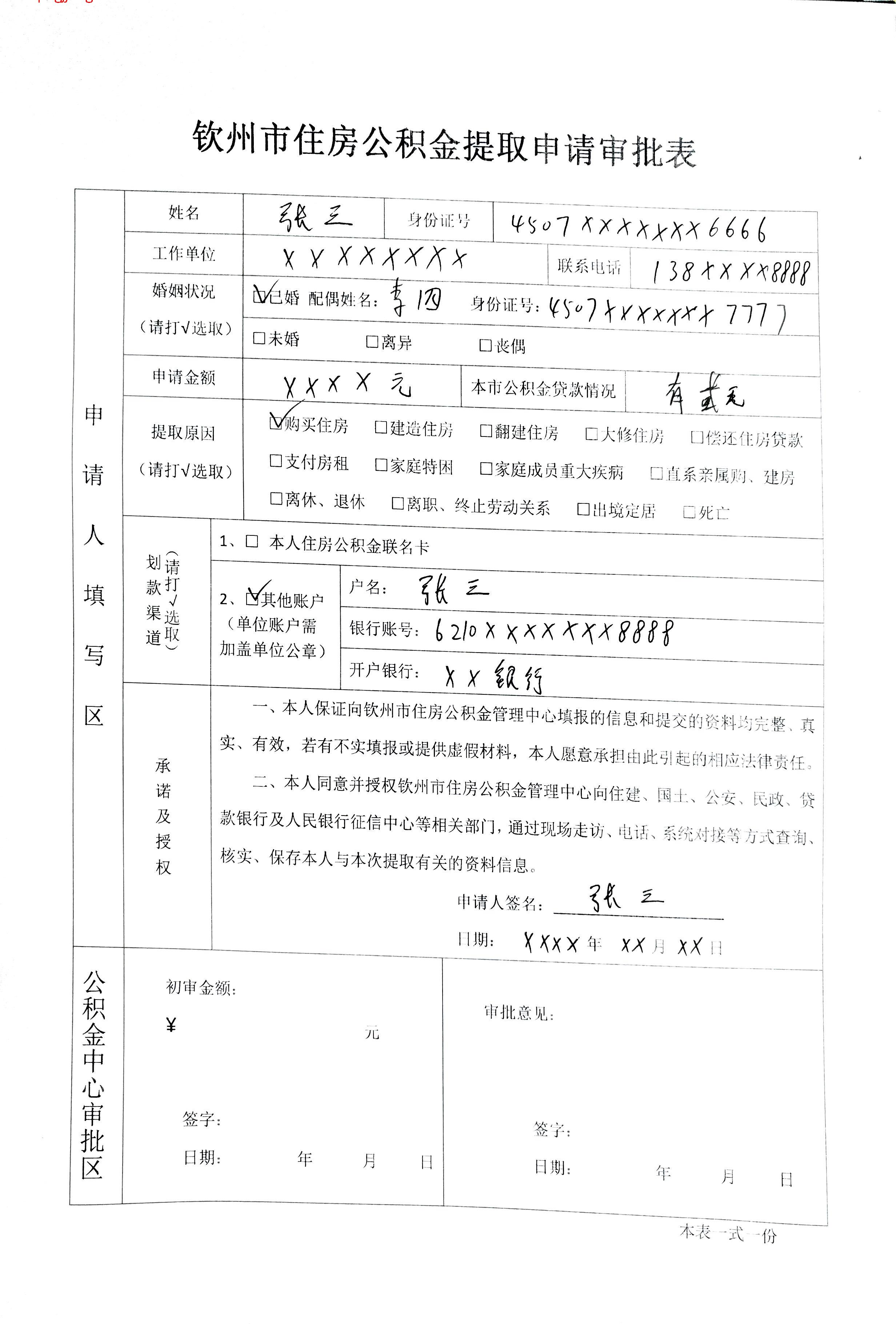 钦州市住房公积金提取申请审批表--填写范例