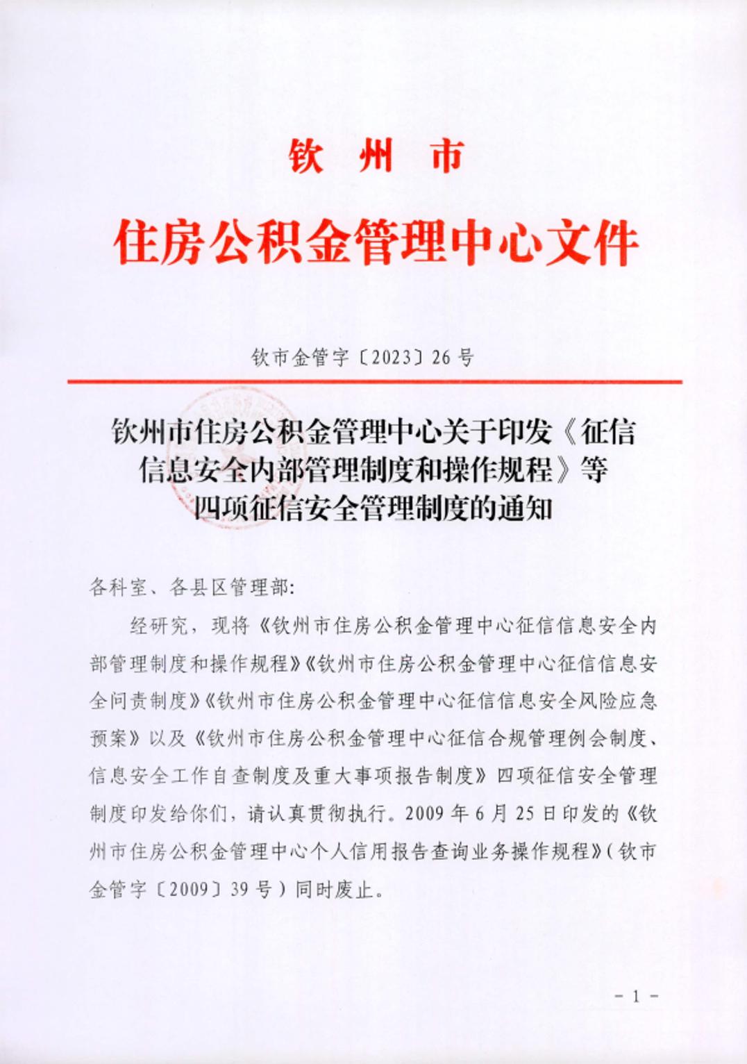钦州市住房公积金管理中心关于印发《征信信息安全内部管理制度和操作规程》等四项征信安全管理制度的通知