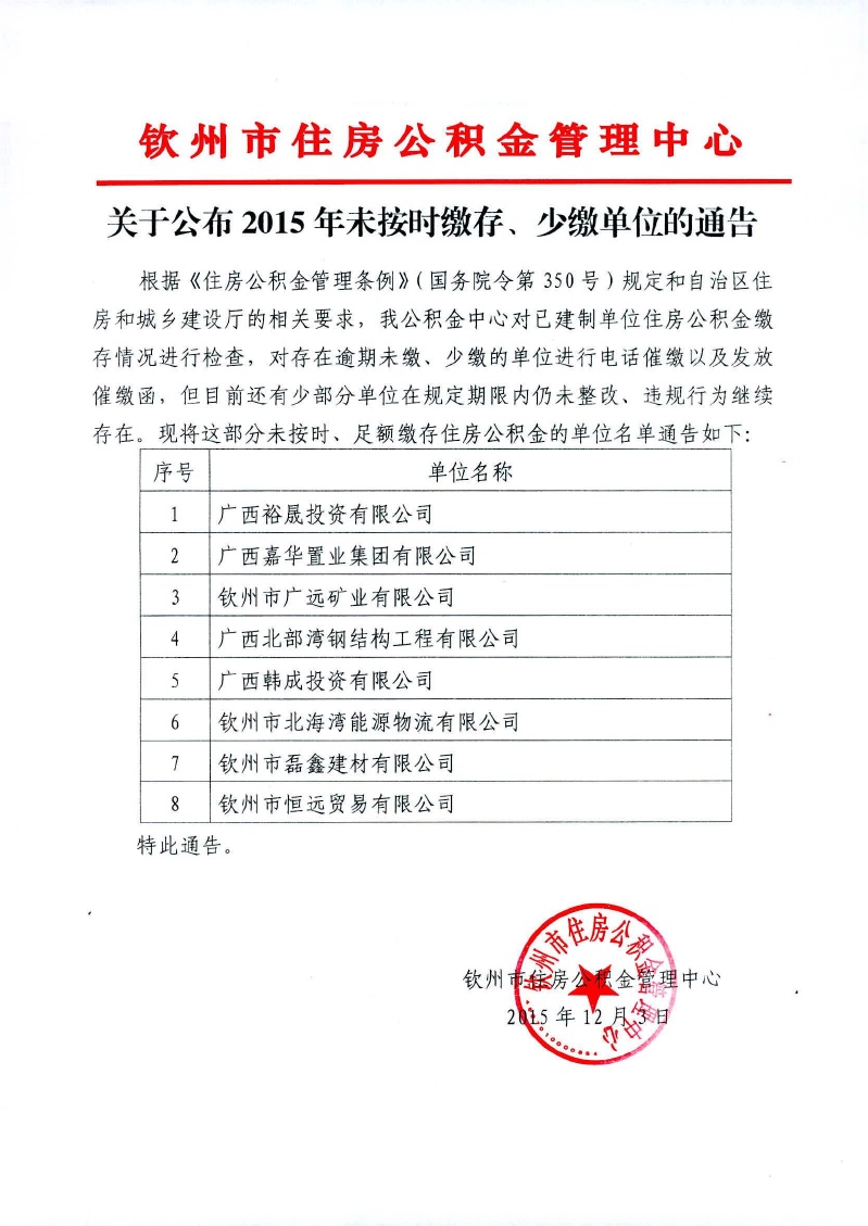 关于公布2015年未按时缴存、少缴单位的通告
