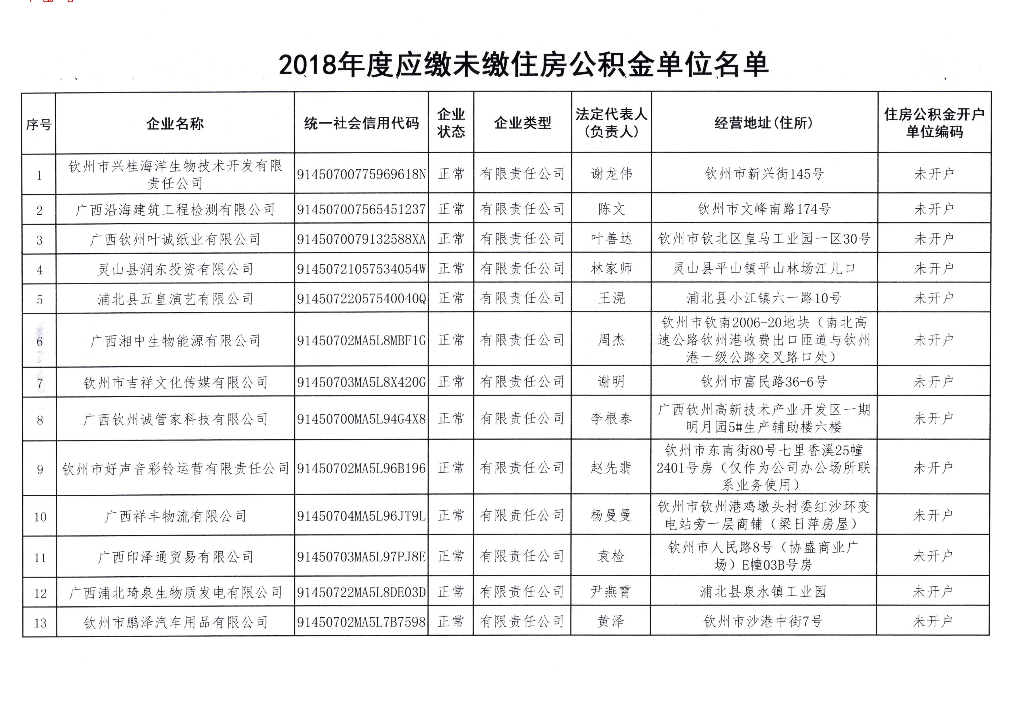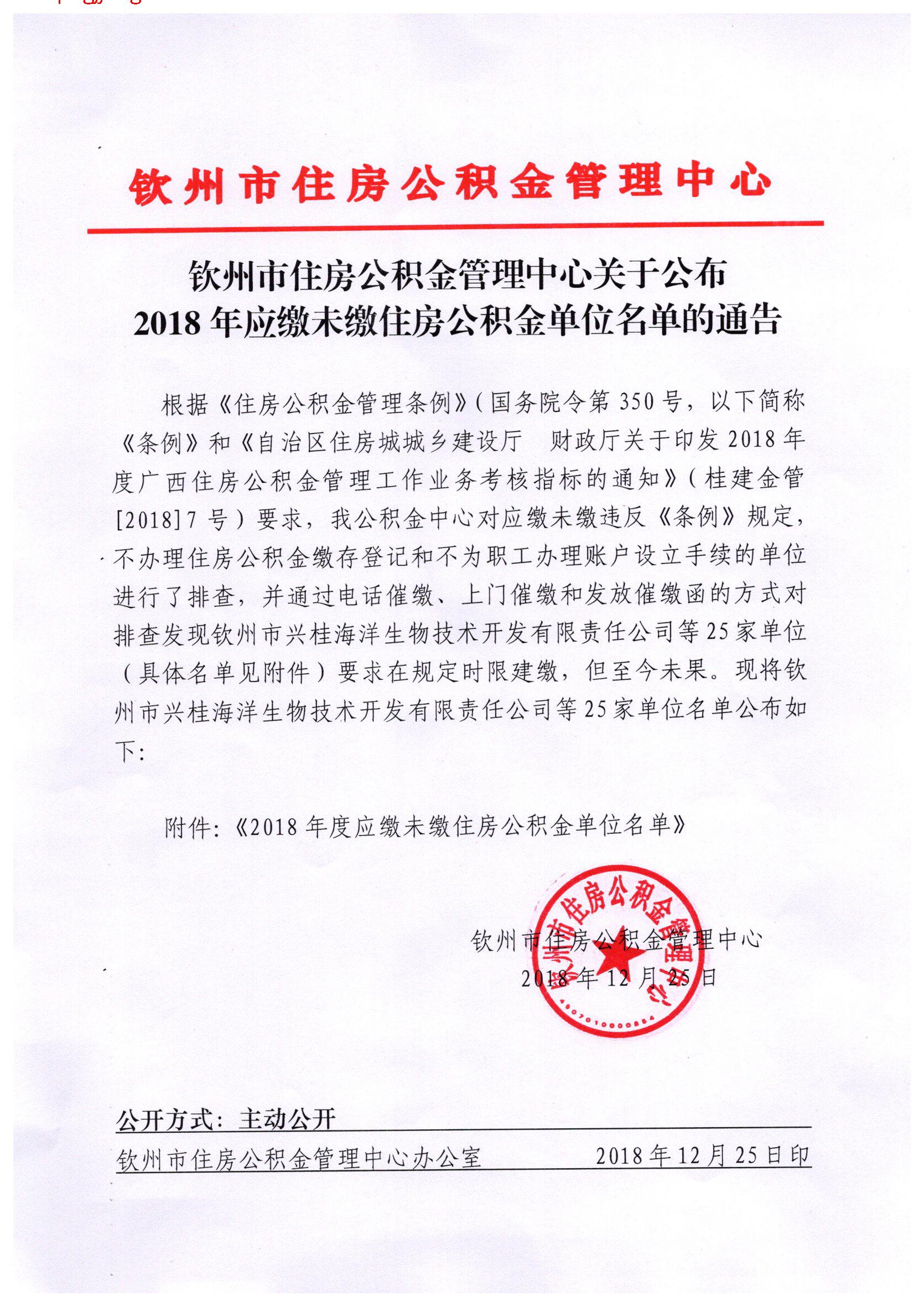 钦州市住房公积金管理中心关于公布2018年应缴未缴住房公积金单位名单的通告