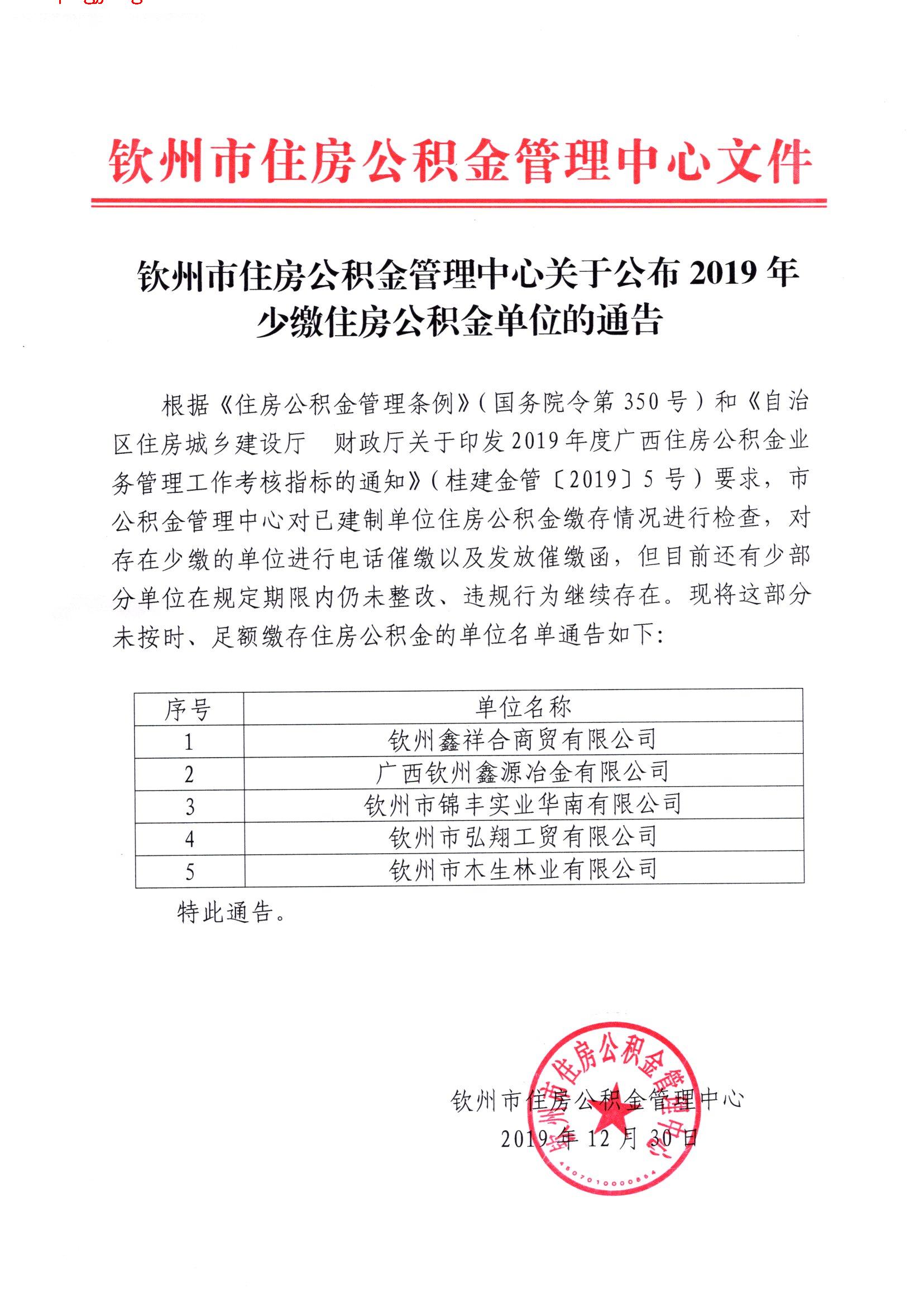 钦州市住房公积金管理中心关于公布2019年少缴住房公积金单位的通告
