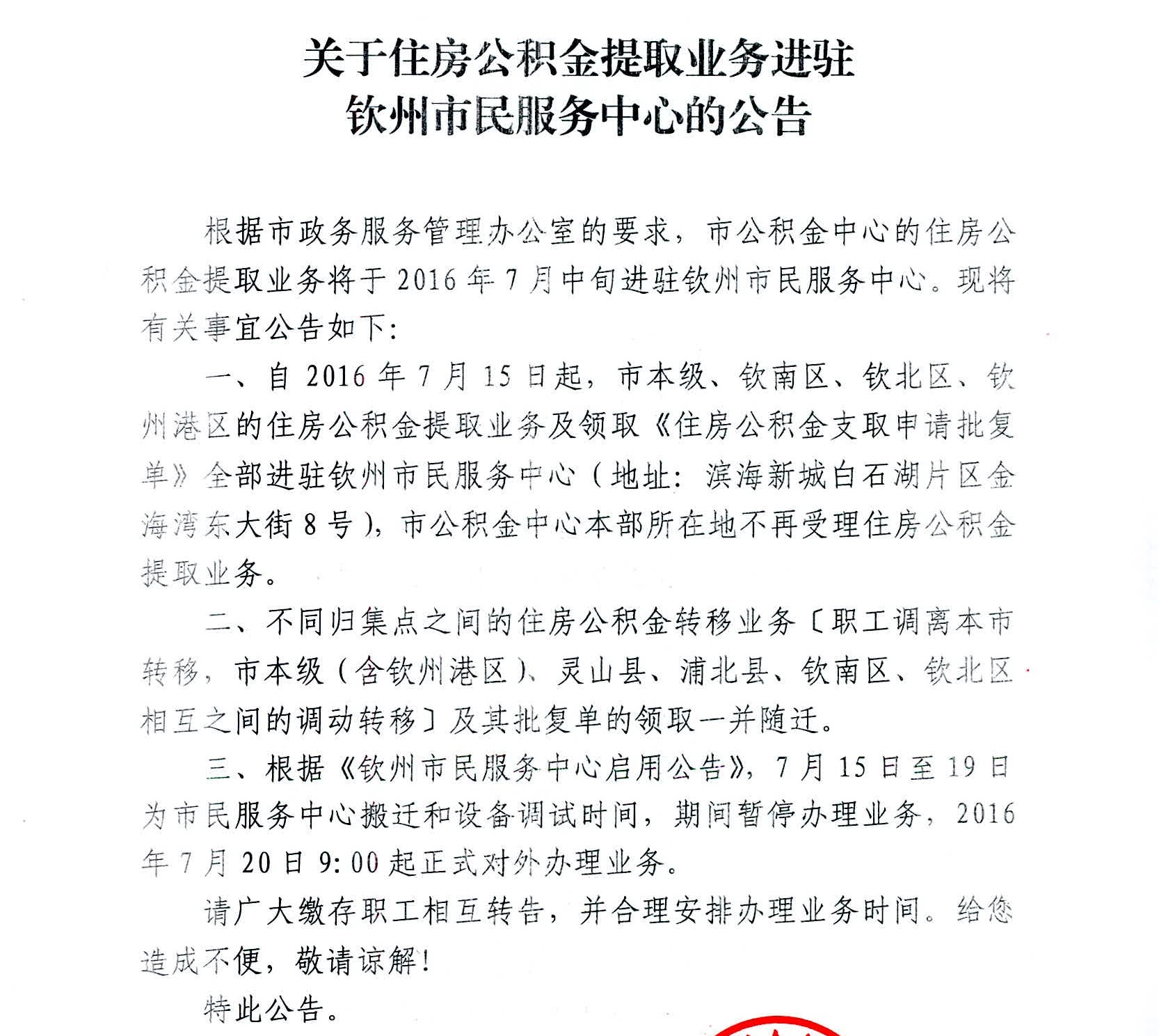 关于住房公积金提取业务进驻钦州市民服务中心的公告