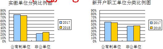 缴存结构中“非公单位”占比上升。从实缴单位性质看,2018年公有制单位(含国家机关和事业单位、国有企业、城镇集体企业)实缴单位数占74.47%,非公单位(含外商投资企业、城镇私营企业及其他城镇企业、民办非企业单位和社会团体等)实缴单位数占25.53%,非公单位占比较2017年提高2.82个百分点;新开户职工中,公有制单位职工占54.19%,非公单位职工占45.81%,非公单位职工占比较2017年提高2.04个百分点。2018年4月起,开展个人自愿缴存住房公积金,共有245人自愿缴存住房公积金,进一步扩大了住房公积金制度覆盖面。