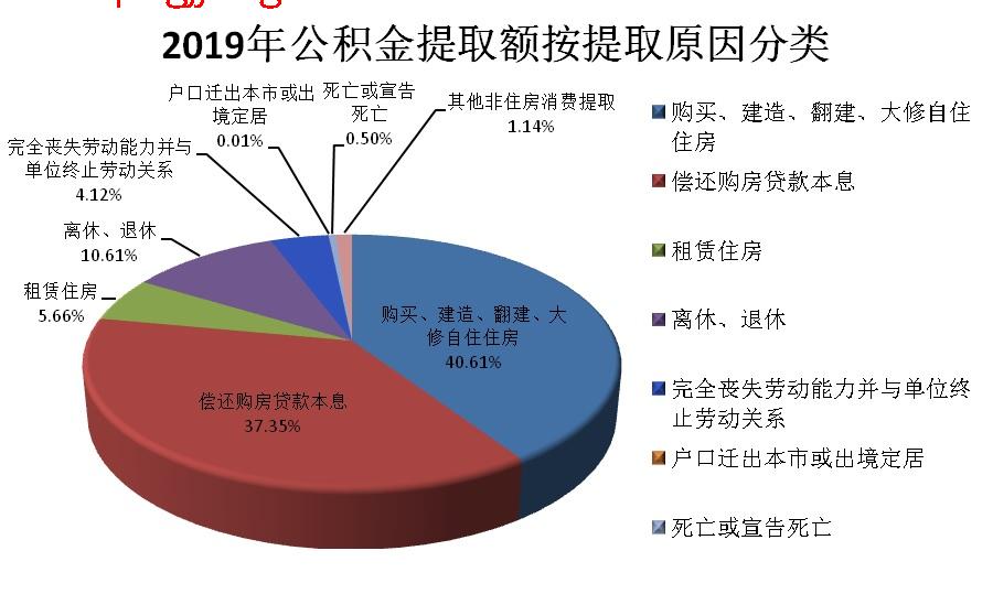 (一)提取额超八成用于住房消费,支持住房消费作用明显。2019年市公积金管理中心继续改进服务方式,提供便利服务,全力支持缴存职工的住房消费提取。全年有5.66万名缴存职工提取住房公积金额14.46亿元,比上年增长14.57%、16.90%,提取率(当年提取额占当年缴存额的比率)为75.20%。提取金额中,从提取类型来看,住房消费类提取占据主导地位,达到当年提取总额的83.62%,同比增长5.24%。其中,购买、建造、翻建、大修自住住房占40.61%,较上年增长4.93个百分点;偿还购房贷款本息占37.35%,较上年降低1.10个百分点,有效减轻职工贷款还款压力;租赁住房占5.66%,比上年增加1.85个百分点,满足了更多无房职工的住房需求。