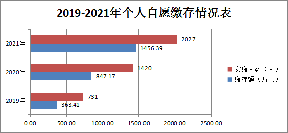2021年市公积金管理中心继续加大自愿缴存政策宣传和建缴服务力度,通过中心官网、微信公众号、手机APP等广泛宣传引导个人自愿缴存住房公积金,实现自愿缴存业务零跑腿,手机即可申请办理,大大方便了灵活就业群众。2021年全市共2027人参加自愿缴存业务,缴存金额1456.39万元。全年共发放个人自愿缴存贷款136笔3547.10万元。截至2021年12月底,已发放个人自愿缴存贷款219笔5899.30万元。自愿缴存业务充分保障了自由职业者、个体工商户、进城务工人员等灵活就业人员的权益。