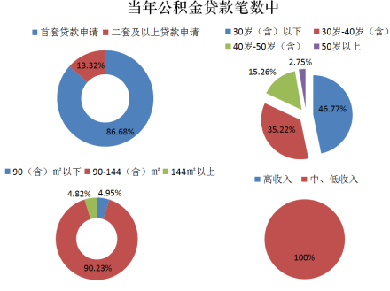 (二)贷款重点支持首套刚需,助力中青年群体安居。我市住房公积金贷款的支持对象主要为中低收入群体,在贷款职工中,中低收入群体所占比重达100.00%。同时,购买首套住房申请贷款的占86.68%。购买新房的职工占96.58%。40岁以下购房职工占81.99%。就职工申请住房公积金贷款购买住房的面积来看,住房公积金贷款主要支持职工购买中小户型住房,职工使用住房公积金贷款所购住房套数中,购买面积为90-144(含)平方米的普通住房的占95.18%,住房公积金支持住房刚性需求明显,进一步促进了我市房地产市场的健康平稳发展。