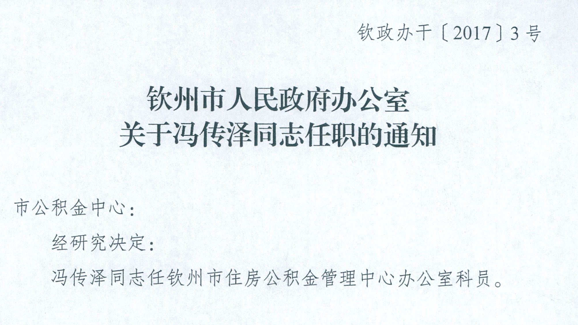 钦州市人民政府办公室关于冯传泽同志任职的通知