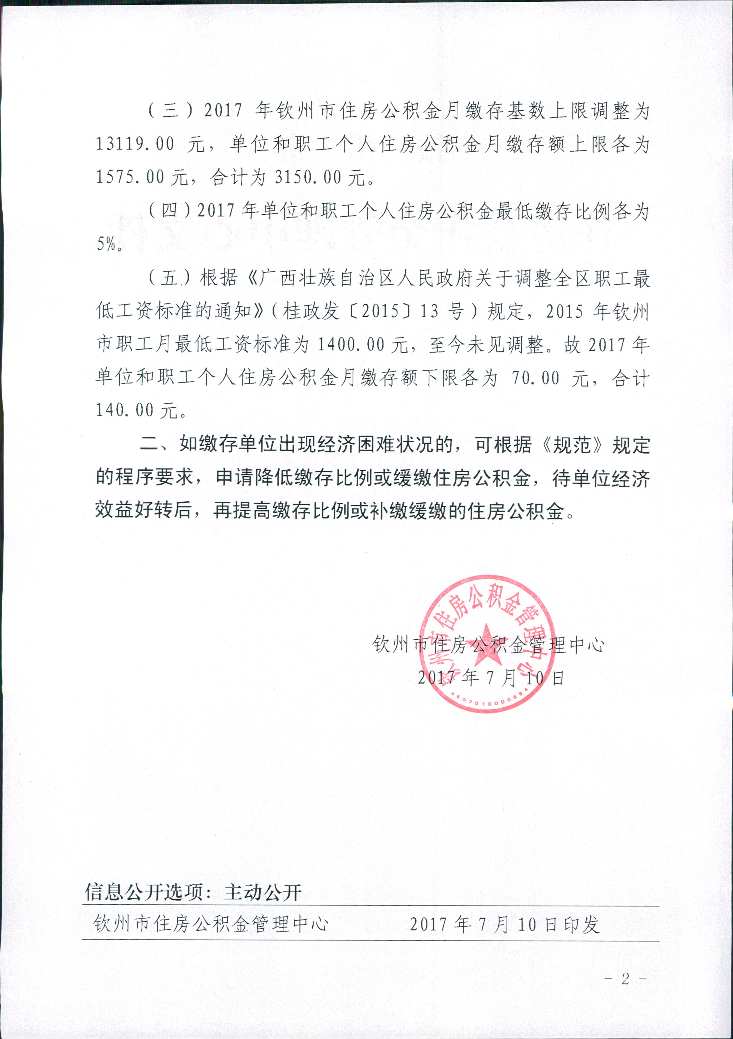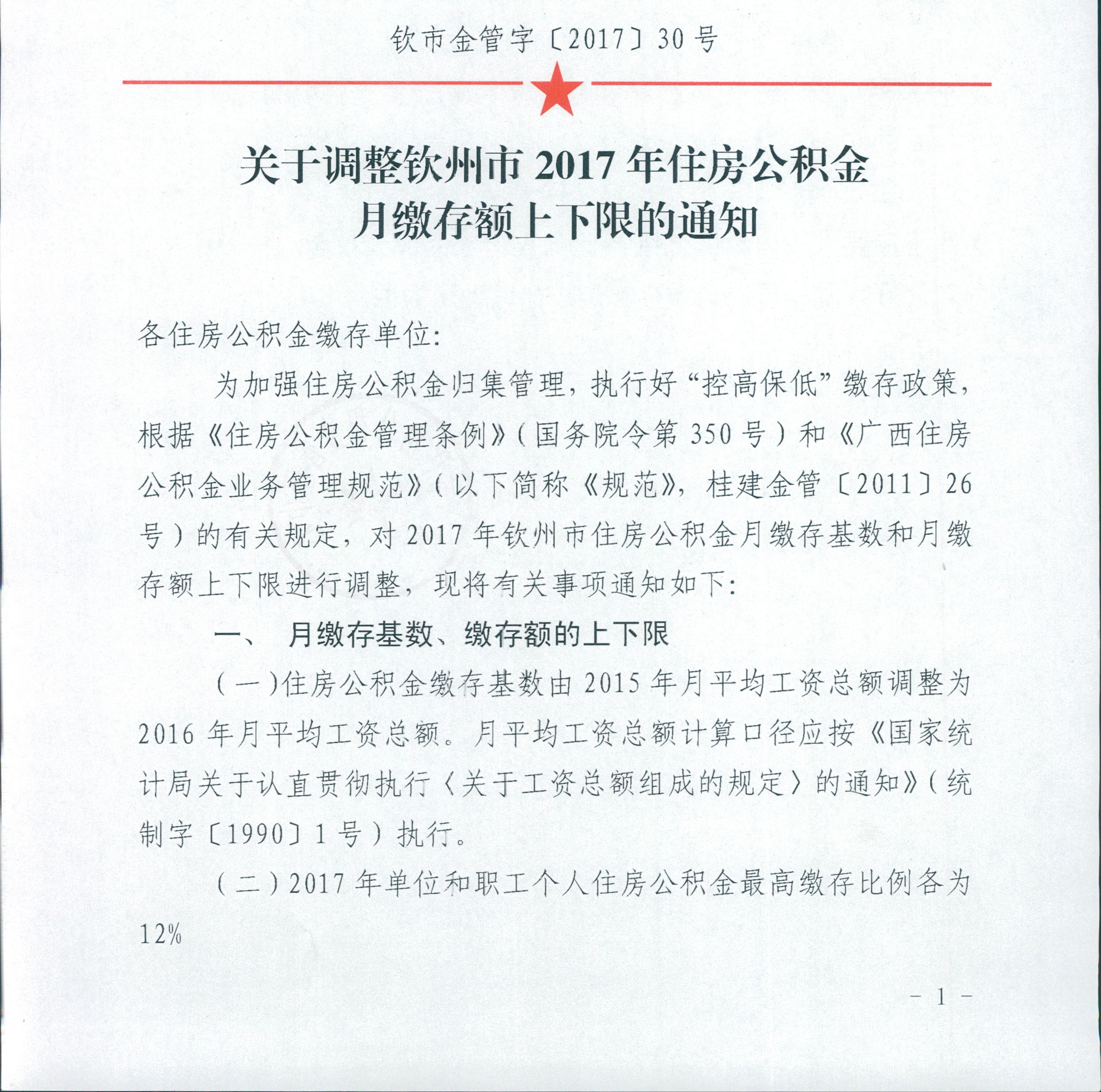 关于调整钦州市2017年住房公积金缴存额上下限的通知