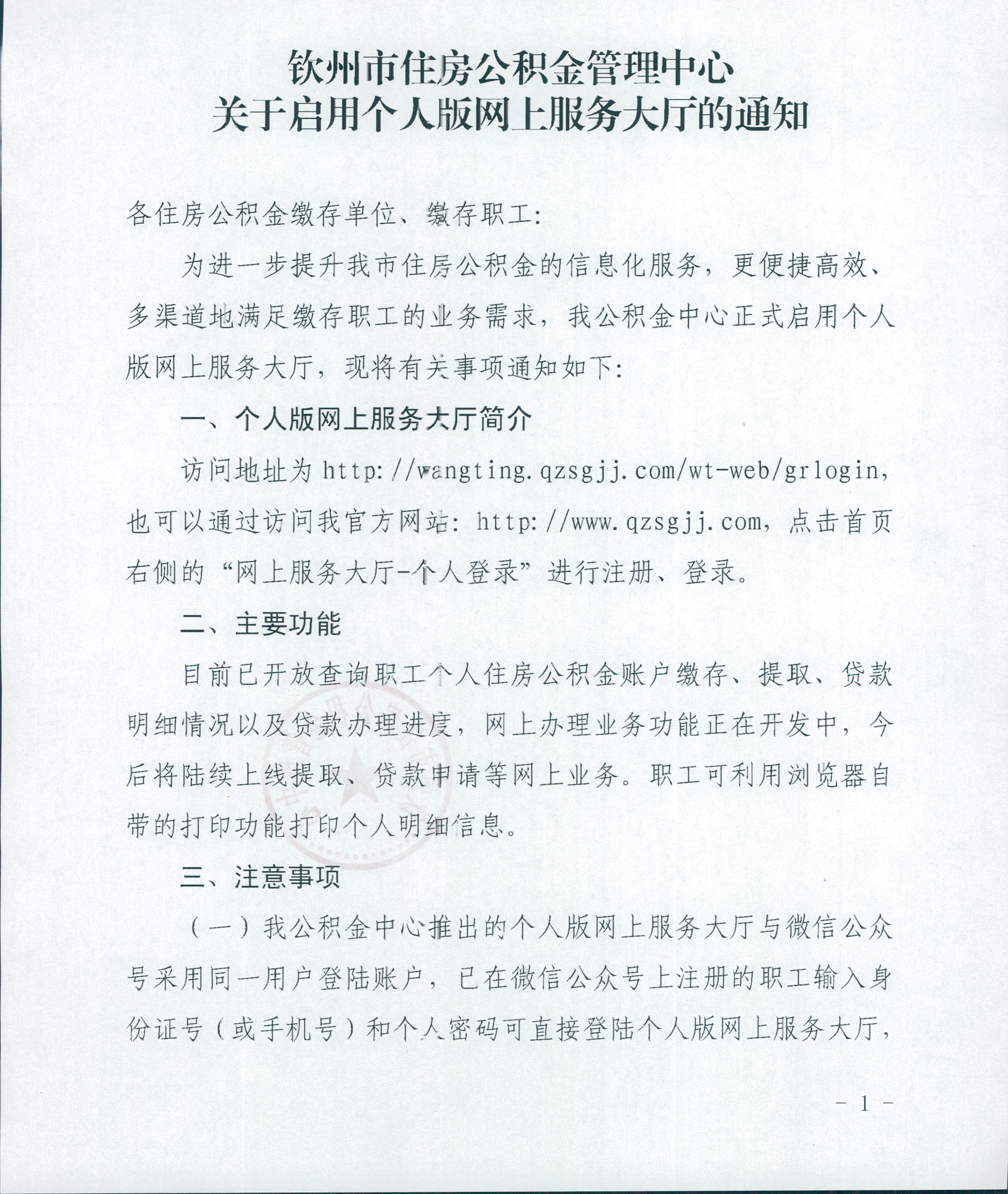 关于启用钦州市住房公积金管理中心个人版网上服务大厅的通告