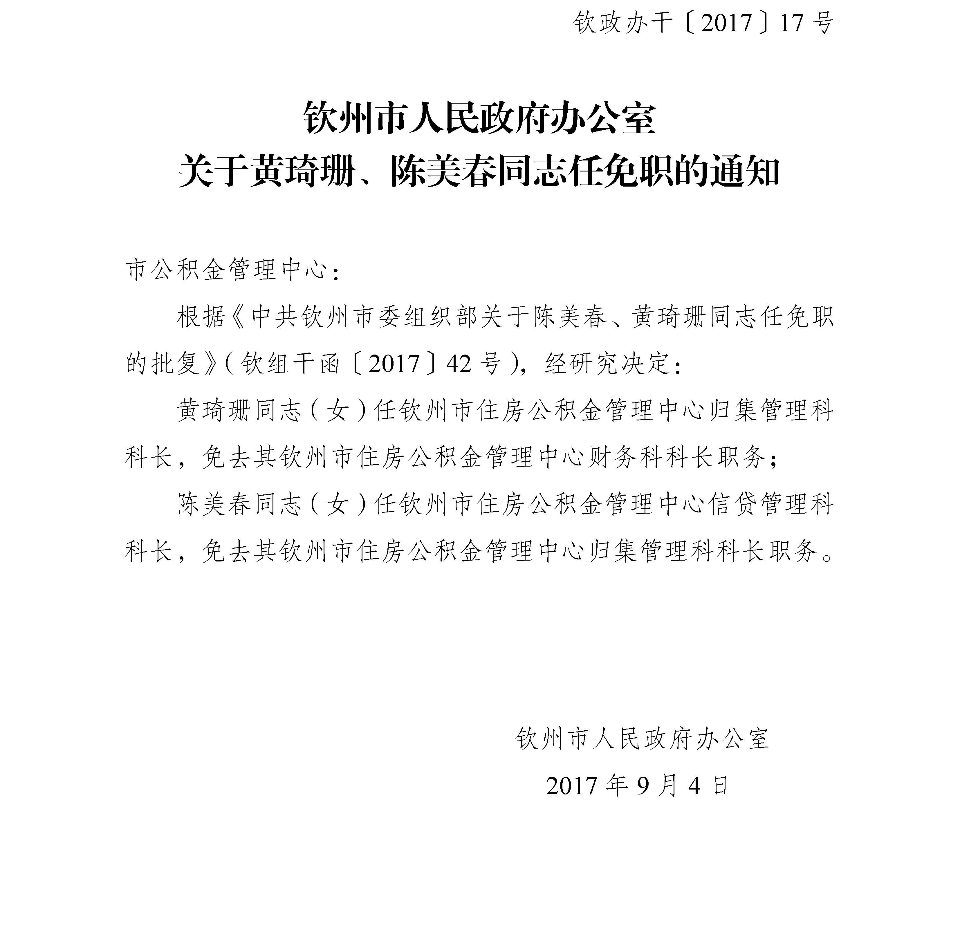 关于黄琦珊、陈美春同志任免职的通知