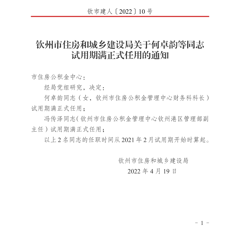 钦州市住房和城乡建设局关于何卓韵等同志试用期满正式任用的通知